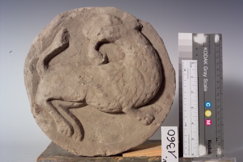patera di forma circolare che racchiude un quadrupede, forse un leone, preso con la testa rivolta all'indietro.