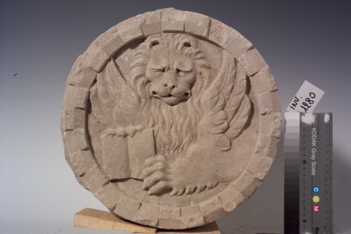 patera di forma circolare con contorno a dentelli e leone in moleca con un libro sulla destra.