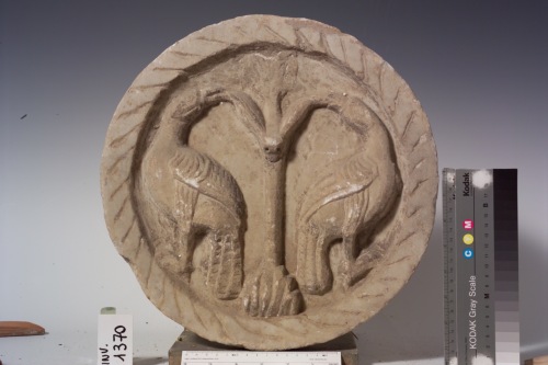 patera di forma circolare che racchiude due uccelli affrontati di schiena resi nell'atto di beccare dei frutti da un albero centrale.