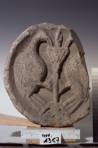 patera di forma circolare che racchiude due uccelli affrontati resi nell'atto di appoggiarsi ad un probabile candelabro.
