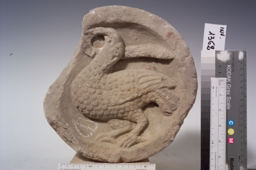 patera di forma circolare che racchiude un animale fantastico con corpo di uccello e testa di serpente.