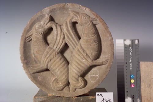 patera di forma circolare che racchiude animali fantastici con corpo di probabile lupo, ali e coda di pesce?, rampanti resi nell'atto di affrontarsi di schiena.