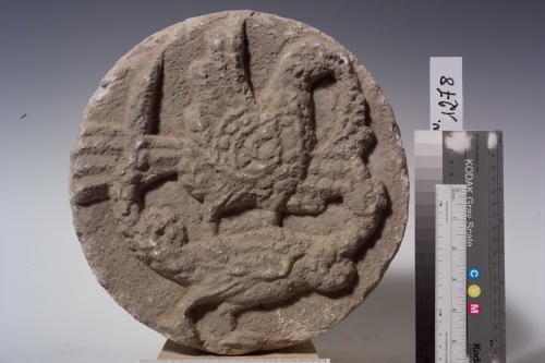 patera di forma circolare che racchiude un volatile nel partito superiore reso nell'atto di ghermire e beccare un animale fantastico sottostante.