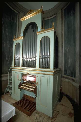 Prospetto in tre campate, ciascuna formante una cuspide, di 7-9-7 canne instagno con baffi, appartenente al Principale 8' del G.O., labbro superioree scudo sporgente, canna maggiore è al Fa#1. Andamento bocche canne di prospetto: campate laterali: pressoché rettilineo; campata centrale: contrario all'andamento della cuspide. Profilo planimetrico del prospetto: rettilineo. Consolle a finestra. Trasmissione meccanica a bilancia. Due tastiere,originali, cromatiche, di 56 tasti, estensione Do1-Sol5, ricoperte in osso ed ebano, I G.O., II O.E. Pedaliera concava parallela, cromatica, indipendente, di 27 pedali, estensione Do1-Re3. Registri azionati con tiranti a pomello, in unica fila orizzontale sopra la II tastiera, cartellini in materiale ceramico, a stampa, caratteri corsivi, originali, applicati sui pomelli stessi. Disposizione fonica: G.O.: Principale 8, Ottava 4, Decima quinta 2, Pieno 2 file, Dulciana 8, Voce celeste 8; O.E.: Bordone 8, Gamba 8, Salicionale 4, Eolina 8 (oscillante), Oboe 8 (recte: oggi flautino 2); Ped.: Ped.Subbaso 16, Ped Bordone 8. Accessori: 6 pedaletti ad incastro, in ferro, posti frontalmente sopra la pedaliera; cartellini in osso, incisi e smaltati con scritte in blu, applicati anteriormente e parte orizzontalmente nelle tavole sottostanti la I tast. Al di sotto della prima tastiera: Unione ped. alla I tast., Unione ped. alla II tast., Unione I tast. Alla II, Forte I tast., Forte II tast.. Tremolo (scritta recentiore: in origine: oboe) (al II man). Staffa a bilico per l'Espressione (in origine comandata da pedaletto ad incastro); 3 pistoncini, in osso, 2 per la comb. fine (funzionante mediante leve Barker), più il relativo annullatore.