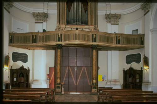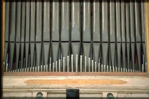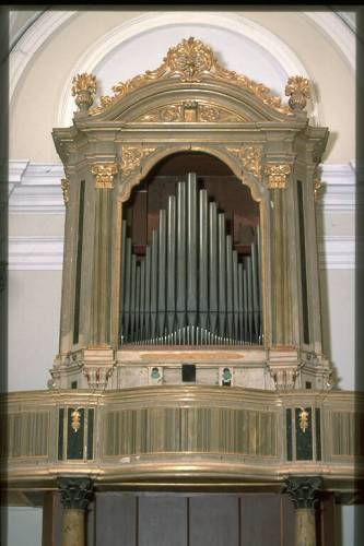 Prospetto in unica campata, a cuspide centrale con ali laterali ascendenti, formato da 21 canne in stagno, appartenenti al Principale I Bassi, labbro superiore. Canna maggiore Do1; andamento bocche rettilineo; profilo planimetrico rettilineo. Ai piedi del prospetto le canne ad ancia del Violoncello e dei Tromboncini. Consolle a finestra. Trasmissione meccanica sospesa. Una tastiera originale, cromatica, di 54 tasti, estensione Do1-Fa5, ricoperta in osso con frontalini in ebano; cromatici in pero tinto, con copertura superiore in ebano. Pedaliera diritta, non originale, cromatica, costantemente unita al manuale, di 26+1 pedali, estensione Do1-Do#3, reali 12 norte, 27° pedale Tamburo. Quadro fonico originale, alla destra dell'organista; registri azionati da tiranti a pomello ricostruiti in epoca recenziore (come la relativa catenacciatura), in due file verticali. Cartellini a stampa, a lettere capitali nere. Crivello in legno, foderato sopra e sotto con carta; bocche delle canne soprastanti, ad eccezione della Voce Umana.