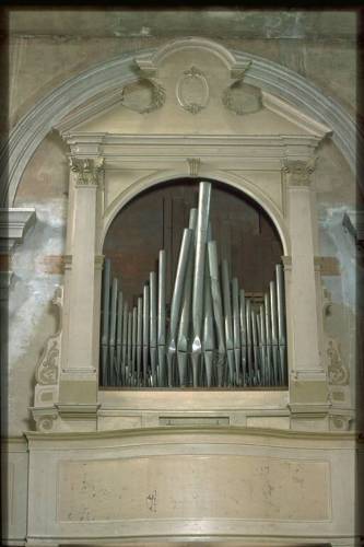 Prospetto in unica campata, a cuspide centrale con ali laterali ascendenti, formato da 23 canne in stagno, labbro superiore a mitria, appartenente al Principale 8. Canna maggiore Do1. Andamento delle bocche rettilineo, profilo planimetrico rettilineo. Consolle a finestra. Trasmissione meccanica. Una tastiera , originale, con prima ottava corta, di 54 tasti, estensioneDo1- La5, ricoperta in osso ed ebano. Pedaliera a leggio, in sesta, di 17+2 pedali, estensione Do1-Sol#2, reali 12 note, costantemente unita alla tastiera, 18° pedale Terza Mano, 19° Timballone; cromatici non ricoperti. Quadro fonico alla destra dell'organista; registri azionati da comandi a manetta a scorrimento orizzontale con incastro a sinistra, disposti in due file verticali; cartellini cartacei, a stampa, originali, stampatello minuscolo nero.
