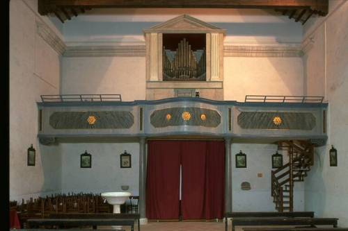 Prospetto in unica campata, a cuspide centrale con ali laterali ascendenti, formato da 27 canne in stagno appartenenti al Principale 8', la canna maggiore è il DO 2. Labbro superiore a scudo, andamento delle bocche rettilineo, profilo planimetrico rettilineo. Ai piedi del prospetto, le canne dei Tromboncini. Consolle a finestra. Trasmissione meccanica sospesa. Una tastiera, originale, in sesta di 45 tasti, estensione DO 1 - DO 5, ricopertain bosso ed ebano con intarsio lineare in bosso sui cromatici e lavorazione a chiocciola dei frontalini dei diatonici. Pedaliera, originale, a leggio, costantemente unita alla tastiera, in sesta di 17 più 1 pedali, estensione DO 1 - SOL# 2, reali 12 note, 18° pedale tamburo. Registri azionati datiranti a pomello, in legno dipinto di nero, in unica fila verticale; quadro fonico alla destra dell'organista; cartellini manoscritti, recenti.