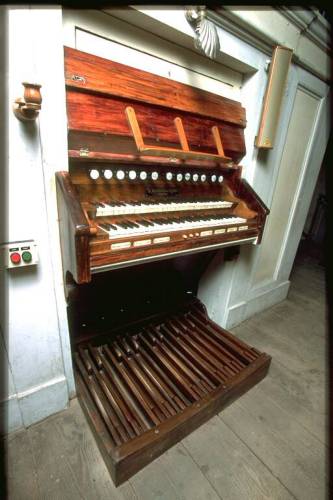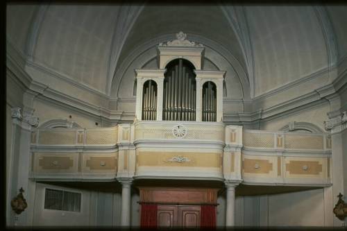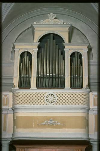 Prospetto in tre campate, ciascuna delle quali a cuspide, di 7-11-7 canne in stagno con baffi, labbro superiore a scudo sporgente, appartenenti al Principale 8' del Grand'Organo, canna maggiore è il Fa1. Andamento delle bocche: rettilineo; profili planimetrici: rettilinei. Consolle a finestra. Trasmissione meccanica a bilancia. Due tastiere originali, cromatiche, di 56 tasti, estensione Do1-Sol5, ricoperte in osso ed ebano. Pedaliera originale, cromatica, indipendente, concava parallela di 27 pedali, estensione Do1-Re3. Registri azionati da tiranti a pomello, in unica fila sopra la II tastiera; cartellini in ceramica, circolari, applicati frontalmente sui pannelli stessi; scritte a stampa, caratteri corsivi neri.