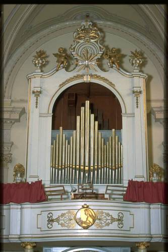 Organo di autore ignoto, restaurato ed ampliato (anche se nel catalogo della ditta Inzoli risulta costruito ex novo) dalla Ditta Cav. Pacifico Inzoli di Crema nel 1899, op.147, poi di nuovo manomesso, probabilmente nella prima metà del XX sec. da ignoto. Prospetto in unica campata, formante tre cuspidi, costituito da 23 canne, non originali, in zinco verniciato a porporina d'alluminio, labbri a porporina dorata, con baffi, labbro superiore a scudo di foggia particolare (staccato, nella parte superiore, dal corpo della canna), labbro inferiore pure staccato, nella sua parte inferiore, dal corpo della canna. Registro di appartenenza: Principale 8'; canna maggiore: Do1. Le canne di facciata sono le uniche del manuale ad essere fuori cassa espressiva (aggiunte posteriormente: l'intervento ha comportato anche lo spostamento in avanti del prospetto). Andamento delle bocche: oppostoalle cuspidi; profilo planimetrico: rettilineo. Consolle a finestra. Trasmissione meccanica sospesa. Una tastiera di 61 tasti (precedentemente 49, in origine probabilmente 45), cromatica, estensione Do1-Do6, ricoperta dal Do1 al Si4 in osso ed ebano, dal Do5 al Si5 in galalite ed ebano, Do6 in osso. Sulla mensola di supporto del telaio della tastiera è evidente l'allungamento subito nel XX secolo; anche i cromatici della parte aggiunta sonodi fattura diversa da quelli dell'Inzoli. Pedaliera diritta, novecentesca,cromatica, indipendente, di 18 + 2 pedali, estensione Do1-Fa2, 19° pedale (corrispondente ad un accessorio soppresso) disattivato, 20° pedale tamburo (ottenuto facendo suonare simultaneamente più canne del Contrabbasso 16'), reali 12 note; cromatici un tempo dipinti di nero. Registri azionati con tiranti a pomello, novecenteschi, in unica fila orizzontale sopra la tastiera (alla destra del manuale resta la sede, oggi chiusa, del quadro fonico originale, non più esistente); cartellini circolari in galalite incisa,scritti in stampatello maiuscolo, nero.