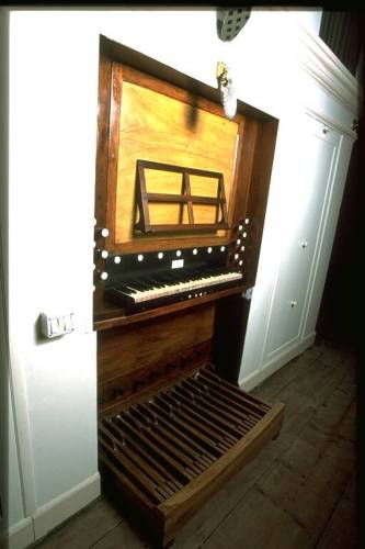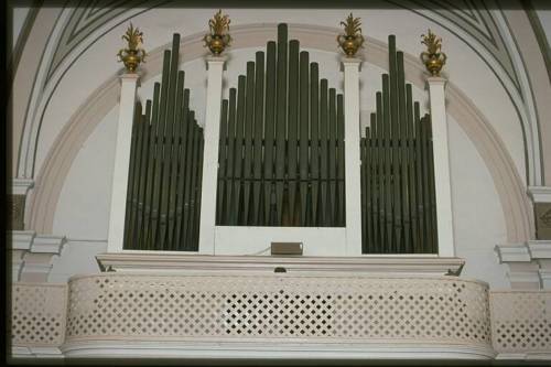 Prospetto in tre campate a cuspide di 11-13-11 canne in stagno con baffi (nelle laterali anche il freno), labbro superiore a mitria; le campate laterali sono costituite da canne della Gamba 8 (canna maggiore: a destra Do1,a sinistra Do#1); la centrale, invece, da canne del Principale 8 (canna maggiore: Mi1); andamento delle bocche: nelle campate laterali opposto alle cuspidi; nella centrale rettilineo; profili planimetrici: rettilinei. Consolle a finestra. Trasmissione meccanica a bilancia. Somiere meccanico a vento, somieri di basseria ad aria comandata, somierini della prima ottava (dal Do2 al Si2) del Principale 16, pneumatici a scarico. Una tastiera originale, cromatica, indipendente, concava, parallela di 27 pedali, estensione Do1 - Re3. Quadri fonici alla sinistra dell'organista per i registri di ripieno, alla destra per quelli di concerto. Registri azionati da tiranti a pomello, cartellini in ferro smaltato, circolari, bianchi, applicati frontalmente sui pomelli stessi. Scritte a stampa, stampatello maiuscolo nero.