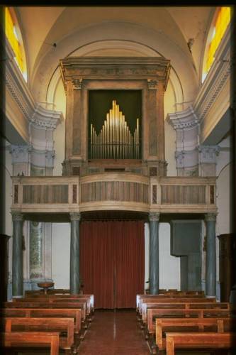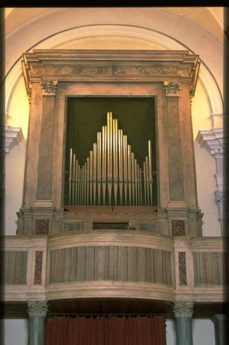 Prospetto in unica campata, a cuspide centrale con ali laterali ascendenti, formato da 27 canne in stagno, labbro superiore a mitria con puntino alla sommità, appartenente al Principale 8'; canna maggiore è il sol 1; andamento bocche: rettilineo; profilo planimetrico: rettilineo. Risultano mancanti n. 3 canne di facciata; alla base di queste si trovano i tromboncini, ora mancanti, come il relativo zoccolo in legno. Consolle a finestra. Trasmissione meccanica a bilancia, in origine sospesa. Una tastiera, non originale, risalente al tardissimo Ottocento o primissimo Novecento, cromatica,di 58 tasti, estensione Do1- La5, diatonici ricoperti in osso, cromatici in pero tinti di nero. I tasti n. 1, 2, 57, 58 sono finti. Pedaliera originale, a leggio, di 17+1 pedali, estensione Do1-Sol diesis 2, reali 12 note,18° pedale Tamburo, con prima ottava corta, costantemente unita alla tastiera, cromatici non ricoperti (i pedali del Do diesis e Sol diesis sono, nella parte sporgente, di spessore inferiore agli altri). Quadro fonico a destra dell'organista; registri azionati da tiranti a pomello disposti su due file verticali; a sinistra i registri di concerto, a destra quelli di ripieno; cartellini cartacei, non recenti, manoscritti a penna, a volte mutili; sotto di questi sono conservati i cartellini originali, a stampa (stampatello minuscolo, nero).