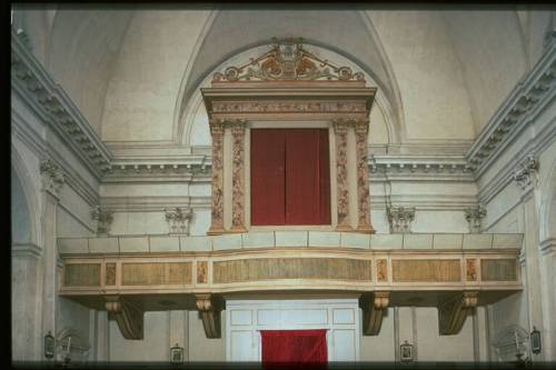 Lo strumento, attualmente, è privo dal 1860 circa, di tutte le canne metalliche ad eccezione di quelle, in zinco, del violoncello 8' al pedale (del Rotelli). Prospetto in unica campata, a cuspide centrale con ali laterali ascendenti, formato da 27 canne appartenenti al Principale 8' canna maggiore: Do 1; profilo planimetrico rettilineo. Consolle di G. Rotelli, addossata al corpo dell'organo. Trasmissione: meccanico-pneumatica per il Grand'Organo, con servocomandi pneumatici collegati, mediante meccanica del Rotelli, alla catenacciatura originale; meccanica a bilancia (io origine sospesa) per l'Organo Espressivo; meccanica per il Pedale; pneumatica (con leve Barker per l'azionamento delle stecche dei somieri) per l'azione dei registri. Due tastiere, cromatiche, di 58 tasti, estensione Do1-La5, ricoperte in galalite ed ebano. Pedaliera, attualmente mancante, cromatica, indipendente, di 27 pedali, estensione Do 1-Re3. Registri azionati da placchette alingua di foggia particolare in unica fila orizzontale sopra la seconda tastiera in legno con copertura in galalite; cartellini circolari, in materiale ceramico, in parte mancanti, applicati sulle placchette stesse, bianchi per il G.O., rosa per le unioni, gialli per l'O.E.; azzurri per il pedale, tutti con bordo dorato. Scritte a stampa, stampatello minuscolo nero con iniziali maiuscole. Sopra la fila delle placchette dei registri, una seconda fila di placchette dello stesso tipo, ma con cartellini circolari piùpiccoli, tutti bianchi con bordo dorato, numerati da 1 a 34, per la combinazione libera.