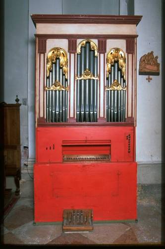 Prospetto in 3 campate di 7-5-7 canne in lega stagno-piombo, labbro superiore a mitria con puntino in rilievo alla sommità, appartenenti al Principale 8', canna maggiore: Mi2. Profilo planimetrico rettilineo; andamento delle bocche: campate laterali: opposto a quello delle sommità; campata centrale: rettilineo. Consolle, per la tastiera, a finestra. Trasmissione meccanica sospesa. Una tastiera originale di 45 tasti, con prima ottava corta, diatonici ricoperti in bosso, con frontalino a chiocciola, cromatici in legno tinto di nero, con listella superiore in ebano. Pedaliera non originale, a leggio, di 9 pedali, ricostruita in occasione del restauro Piccinelli, con prima ottava corta, senza basseria propria, costantemente unita allatastiera per mezzo di spaghi, estensione Do1-Do2, cromatici non ricoperti.Quadro fonico alla destra dell'organista; registri senza indicazione, azionati da tiranti a pomello originali, in ottone, disposti su due file verticali. Accessori senza indicazione azionati da manette a scorrimento verticale con incastro in basso, alla sinistra dell'organista. Tiratutti a pomello senza indicazione, posto sotto la fila dei pomelli dei registri di Ripieno. Disposizione fonica: Voce Umana (dal Do3), Flauto in XII (dal Mi2), Principale 8' (inseribile dal Do2, sempre inserito dal Do1 al Si1), Ottava,XV, XIX, XXII, XXVI, XXIX, Tiratutti. Accessori: Usignoli (mancante), Zampogna (conservata la canna), Tremolo (disattivato, conservata la manetta all'interno dell'organo). Manticeria posta nel basamento dello strumento, costituita da 2 mantici a cuneo a 6 pieghe, originali, alimentati da elettroventilatore, senza possibilità manuale. Somiere a tiro. Ordine dei registri sul somiere maestro, partendo dalla facciata: Principale, Voce Umana, Ottava, Flauto XII, XV, XIX, XXII, XXVI, XXIX. Crivello in legno, non foderato; bocche delle canne sottostanti. Condizioni generali buone, a parte gliaccessori. Condizioni di efficienza buone. Uso liturgico festivo. Temperamento leggermente inequabile.