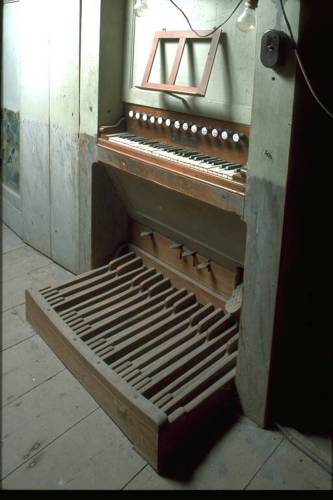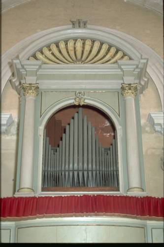 Organo costruito riutilizzando parte della fonica del precedente strumento ottocentesco, costruito da Gaetano Callido nell'anno 1800, op.376. Prospetto in unica campata, a cuspide centrale con ali laterali ascendenti, formato da 25 canne in stagno, appartenenti al Principale 8', con baffi, labbro superiore a mitria con puntino soprastante. Canna maggiore Do1; andamento bocche rettilineo; profilo planimetrico rettilineo. Consolle a finestra.Trasmissione meccanica sospesa. Una tastiera originale, cromatica, di 56 tasti, estensione Do1-Sol5, ricoperte in osso ed ebano. Pedaliera concava parallela, cromatica, indipendente, di 27 pedali, estensione Do1-Re3. Registri con tiranti a pomello, in unica fila orizzontale, sopra la tastiera. Cartellini circolari, in materiale ceramico, applicati frontalmente sui pomelli stessi. Scritte a stampa, corsivo nero. Crivelli in legno foderati sopra e sotto con carta; bocche delle canne soprastanti.