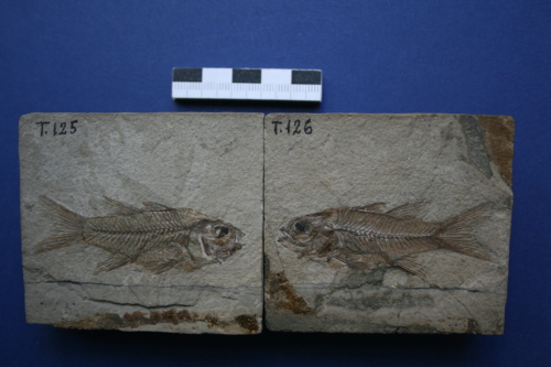 fossile (pesce fossile suddiviso in parte e controparte, esemplare)