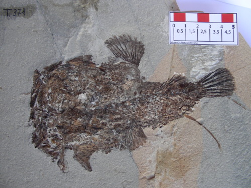 Animalia Chordata Actinopterygii Lophiiformi Ogcocephalidae Tarkus Tarkus squirei: Resto di pesce fossilizzato in roccia calcarea, suddiviso in parte e controparte, composto da: scheletro completo articolato e porzioni di pelle. | Italia , VENETO , VESTENANOVA ( VR ), Bolca