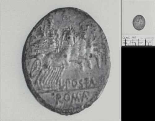 Dritto: Testa elmata di Roma a d.;dietro apex;davanti,X-;c.p.. Rovescio: Marte in quadriga a d. tiene lancia,scudo e redini nella s. e un trofeo nella d.;sotto,L.POST.(AL) B.;all'esergo,ROMA;c.p.