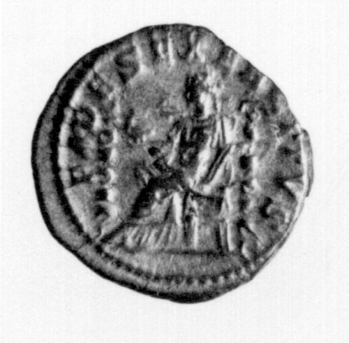 Dritto: IMP.CAES.M.AVR.ANTONINVS AVG.;busto laureato,drappeggiato e corazzato di Elagabalo a destra. Rovescio: FIDES EXERCITVS; Fides seduta a sinistra con aquila e stendardo; davanti, altro stendardo