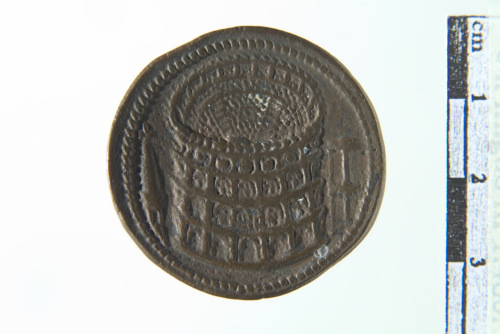 Dritto: Busto laureato di Vespasiano a d.; contorno perlinato. Rovescio: Veduta prospettica panoramica del Colosseo; a s. "Meta Sudans", a d. struttura architettonica a due piani con quattro colonne; contorno perlinato