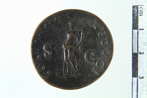 Dritto: Busto laureato di Vespasiano a d.; contorno perlinato. Rovescio: La Fortuna stante a s. con cornucopia e timone poggiante su globo; contorno perlinato