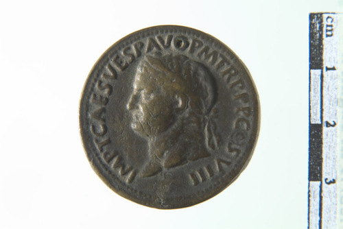 Dritto: Busto laureato di Tito a s.; contorno perlinato. Rovescio: Colonna su piattaforma ornata di statue (Meta Sudans?); contorno perlinato