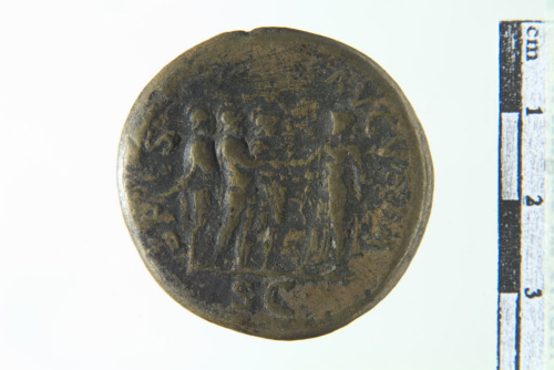 Dritto: Busto laureato di Tito a s.; contorno perlinato. Rovescio: La Spes stante a s. stringe la mano a una figura di armato fiancheggiata da altre due figure di armati; contorno perlinato