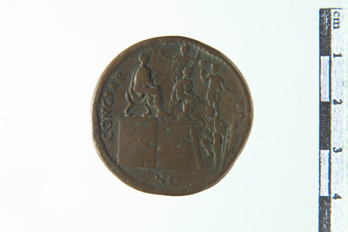 Dritto: Busto laureato di Nerva a d.; contorno perlinato. Rovescio: L'imperatore seduto a d. su sedia curule su suggestum, con rotolo, assiste alla distribuzione di doni a un cittadino che sale sul piedistallo; sullo sfondo Minerva stante frontalmentela Liberalitas e un aiutante stante a s. con tessera annonaria; contorno perlinato