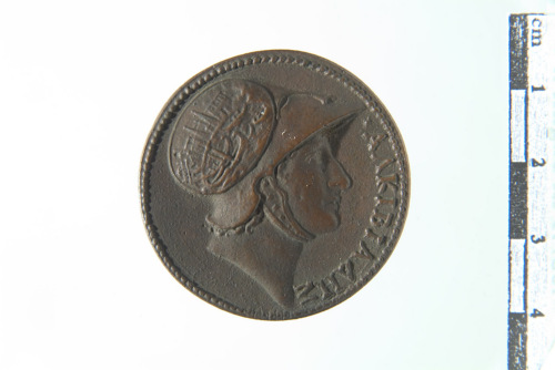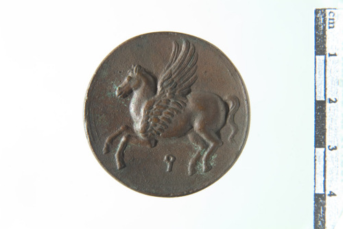 Dritto: Testa con elmo corinzio allacciato sotto il mento e decorato con raffigurazione di porto con navi alla rada, a d.; contorno perlinato. Rovescio: Pegaso di Corinto in volo a s.; contorno perlinato