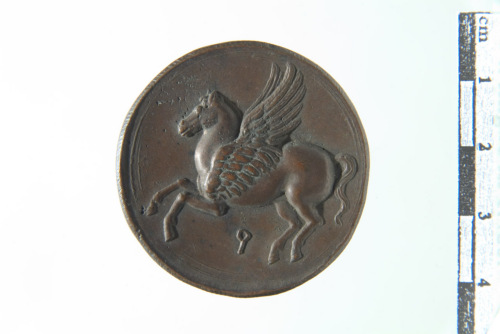 Dritto: Testa laureata a d.; contorno "cordonato". Rovescio: Pegaso di Corinto in volo a s.; contorno a bordo