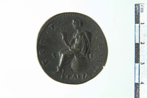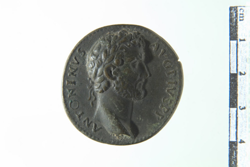 Dritto: Busto laureato di Antonino Pio a d.; contorno perlinato. Rovescio: L'Italia turrita seduta su globo a s. con cornucopia e scettro; contorno perlinato