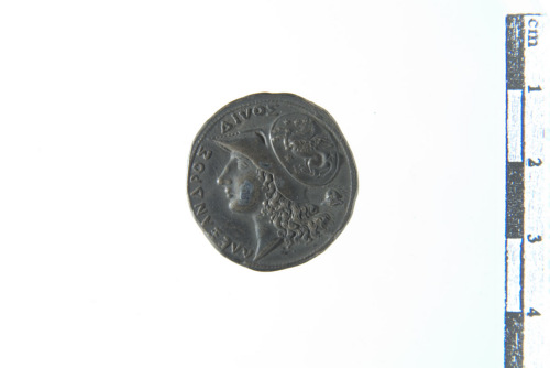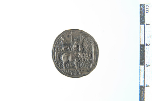 Dritto: Testa a s. con elmo corinzio decorato con raffigurazione di Pegaso a s. circondato da tre stelle; contorno perlinato. Rovescio: Alessandro in quadriga trionfale di elefanti a d., all'entrata di una porta cittadina monumentale ornata con statue di Vittoria; davanti a lui sul carro un prigioniero seduto a d. in atto di sconforto; contorno perlinato