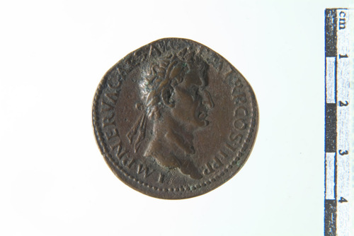 Dritto: Busto laureato di Nerva a d.; contorno perlinato. Rovescio: L'imperatore seduto a d. su sedia curule su suggestum, con rotolo, assiste alla distribuzione di doni a un cittadino che sale sul piedistallo; sullo sfondo Minerva stante frontalmentela Liberalitas e un aiutante stante a s. con tessera annonaria; contorno perlinato