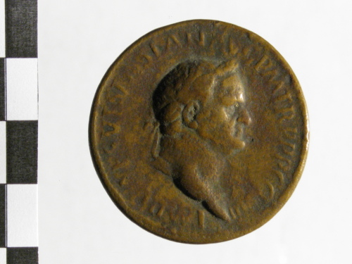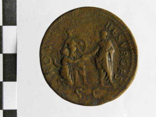 Dritto: busto laureato di Vespasiano a s.. Rovescio: l'imperatore a d. porge la d. a Roma inginocchiata a s. davanti a Minerva che porta elmo e scudo