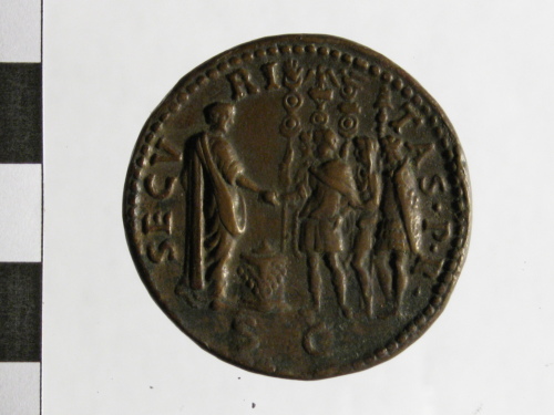 Dritto: testa nuda di Ottone a d.. Rovescio: l'imperatore a d. porge la d. a tre legionari a d. davanti a quattro vessilli/trofei