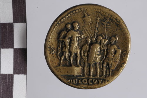 Dritto: busto laureato e drappeggiato di Galba a d.. Rovescio: scena di adlocutio: Galba in abito militare su bassa piattaforma con un ufficiale davanti a lui, sotto di lui due soldati: uno con scudo e trofeo, l'altro con scudo e asta e tra loro un cavallo, dietro altri due soldati