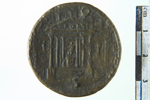 Dritto: profilo di Tiberio laureato a s.. Rovescio: tempio con le lettere SPQR nel frontone