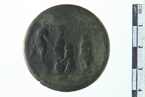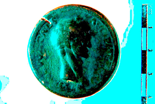 Dritto: profilo di Nerva a d.. Rovescio: scena di donativa: a s. su ceppo figura maschile volta a d. indicante una donna al centro accovacciata che tiene unanfora, al centro cè una figura in piedi con in testa un vaso di frutta. Sul fondo figurazione architettonica