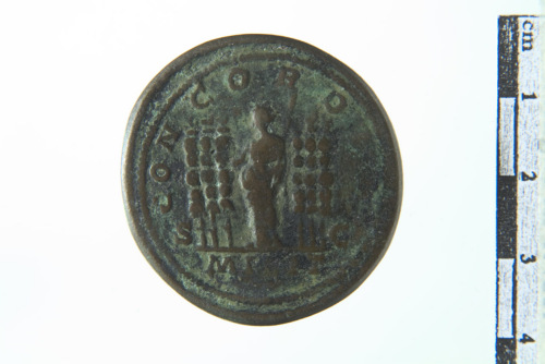 Dritto: profilo di Geta a d.. Rovescio: Figura femminile stante tra due coppie di tre trofei