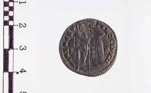 Dritto: S. Marco con nimbo di perline, in piedi a s., porge con la d. il vessillo al Doge genuflesso, che lo prende con ambo le mani,sulla banderuola volta a d., forse è indicato un piccolo leone alato.. Rovescio: Il Redentore, in trono, benedice con la d. e tiene nella s. il Vangelo.