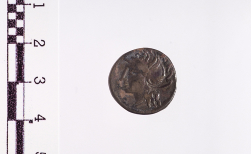 Dritto: Testa elmata di Roma a s.. Rovescio: Saturno in quadriga a d. tiene con la s. le redini e con la d. un'arpa, es. [L.SA]