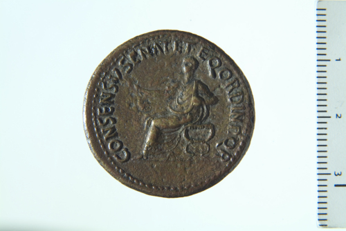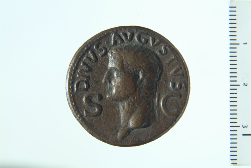 Dritto: Testa del Divo Augusto radiato a s.; contorno perlinato. Rovescio: Divo Augusto laureato e togato seduto a s. su sella curule con ramo; contorno perlinato