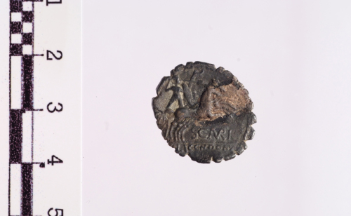 Dritto: testa elmata di Roma a d.. Rovescio: guerriero barbuto e nudo in biga a d., regge lo scudo, le redini e il carniyx con la s., agita la spada con la d., es. L.LIC.CN.DOM