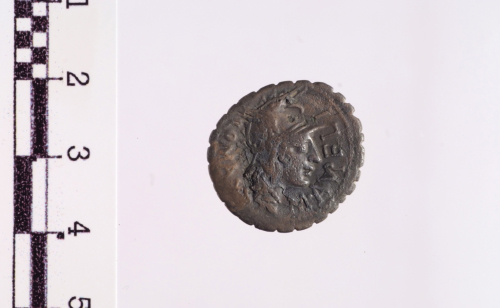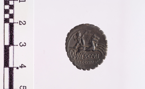 Dritto: testa elmata di Roma a d.. Rovescio: guerriero barbuto e nudo in biga a d., regge lo scudo, le redini e il carniyx con la s., agita la spada con la d., es. L.LIC.CN.DOM