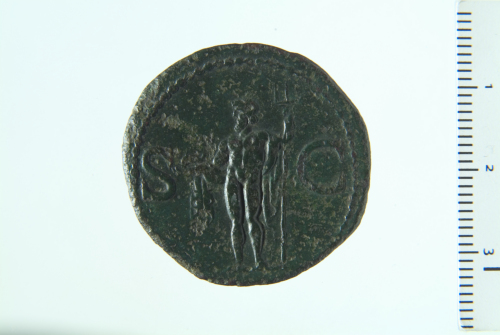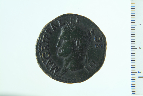 Dritto: Testa di Agrippa con corona rostrata a s.; contorno perlinato. Rovescio: Nettuno stante a s. con mantello, tridente e delfino; contorno perlinato