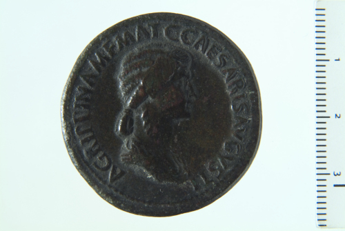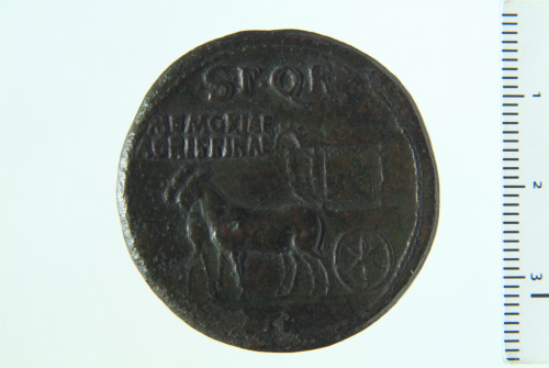 Dritto: Busto drappeggiato di Agrippina con capelli legati a d.; contorno perlinato. Rovescio: Carpentum guidato da due mule a s., con copertura decorata e sorretta da due figure; contorno perlinato