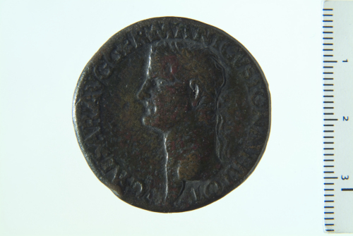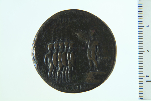 Dritto: Testa laureata di Caligola a s.; contorno perlinato. Rovescio: Caligola togato stante a s. su alto podio arringa in direzione di cinque soldati stanti a d. con elmo, scudo e parazonium, gli ultimi quattro portano un'insegna con aquila; contorno perlinato