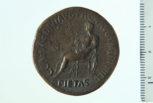 Dritto: Pietas velata e drappeggiata seduta a s. con patera, il braccio sinistro appoggiato su una piccola figura drappeggiata stante frontalmente su base; contorno perlinato. Rovescio: Tempio esastilo con ghirlande sormontato da quadriga, davanti al quale Caligola velato e togato sacrifica con patera su altare ghirlandato; un assistente conduce un toro all'altare, l'altro regge una patera; contorno perlinato