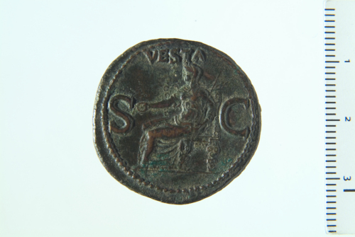 Dritto: Testa di Caligola a s.; contorno perlinato. Rovescio: Vseta velata seduta su trono decorato a s. con patera e lungo scettro trasversale; contorno perlinato
