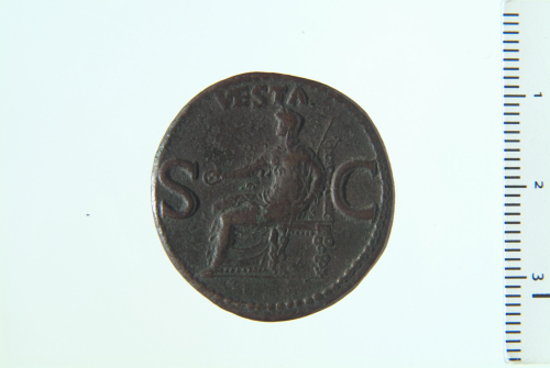Dritto: Testa di Caligola a s.; contorno perlinato. Rovescio: Vseta velata seduta su trono decorato a s. con patera e lungo scettro trasversale; contorno perlinato