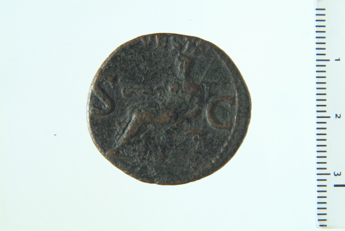 Dritto: Testa laureata di Caligola a s.; contorno perlinato. Rovescio: Vesta velata seduta su trono decorato a s. con patera e lungo scettro trasversale; contorno perlinato